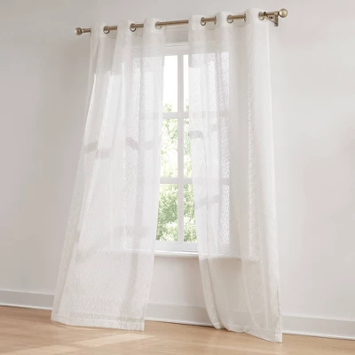Brighten your day with these sheer window curtains. Woven with raindrop shaped tufts, these white curtains are great for modern minimalist style homes. These sheer curtains let in plenty of sunlight while still providing some privacy. Sold as 2 panels, each measuring 38 inches wide by 84 inches long and are crafted from a textured sheer fabric. Easy to install with the metal grommets measuring 1.65″ in diameter, allowing you to easily slide your curtain rod through them. Machine washable for easy care.