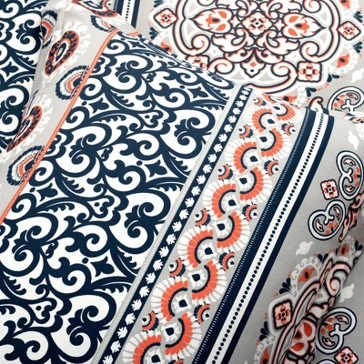 3pc Nesco Stripe Cotton Duvet Cover Set Navy/Coral/Gray – Lush Décor