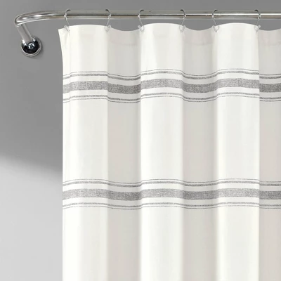 Lush Décor Farmhouse Stripe is the ideal bathroom shower curtain for your shabby chic, modern or farmhouse decor. Horizontal, ticking stripe shower curtain available in two color options. Soft, 100% cotton fabric curtain with a simple, minimalist or country style design for your bathroom. Measures 72 x 72 inches with button holes at top allow for easy installation with any ring or hook. Safe to machine wash cold in a mesh laundry bag and tumble dry low. Follow care instructions on label.