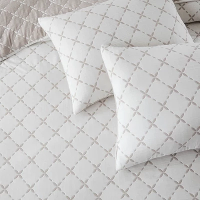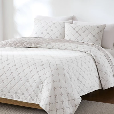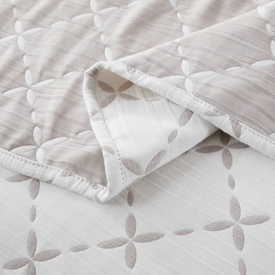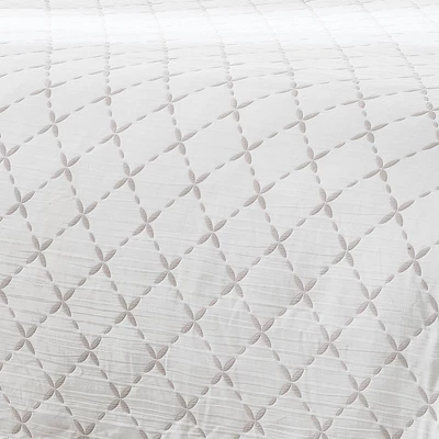 Enjoy two classic looks with this reversible matelasse coverlet set, woven with a stitched diamond pattern adorned with delicate leaves. The reverse has the same pattern with inverted colors. Style with coquette decor, alone or layered for seasonal comfort. Made with a lightweight cotton blend, this 3 piece bedding set includes 1 coverlet and 2 shams. STANDARD 100 by OEKO-TEX® certified, all components have been tested and certified free from harmful substances. Machine washable for easy care.